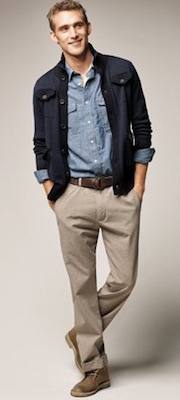 Clásico. Estilo serio. Es el típico esquema que siempre se lleva desde hace más de cincuenta años. Un pantalón con pinzas de tela de algodón con su camisa y jersey conjuntados. En los pies, zapatos. Las prendas no son entalladas sino rectas y no muy ajustadas.