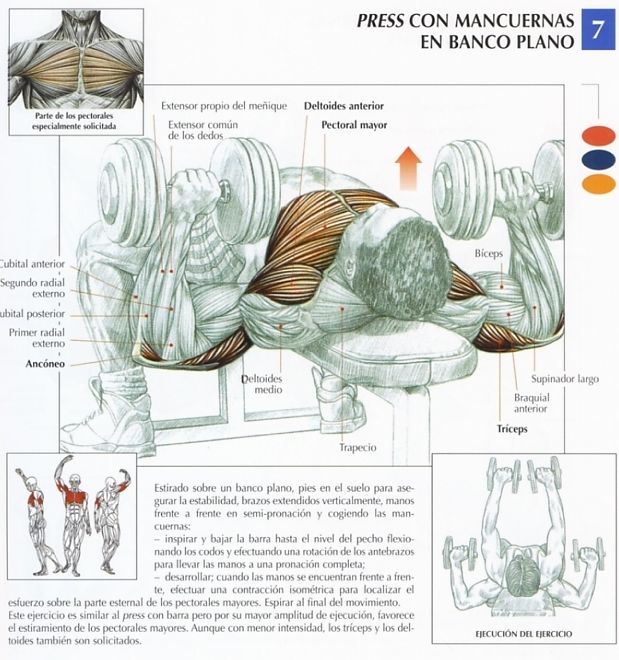1- Press horizontal con mancuerna (volumen del pectoral mayor).