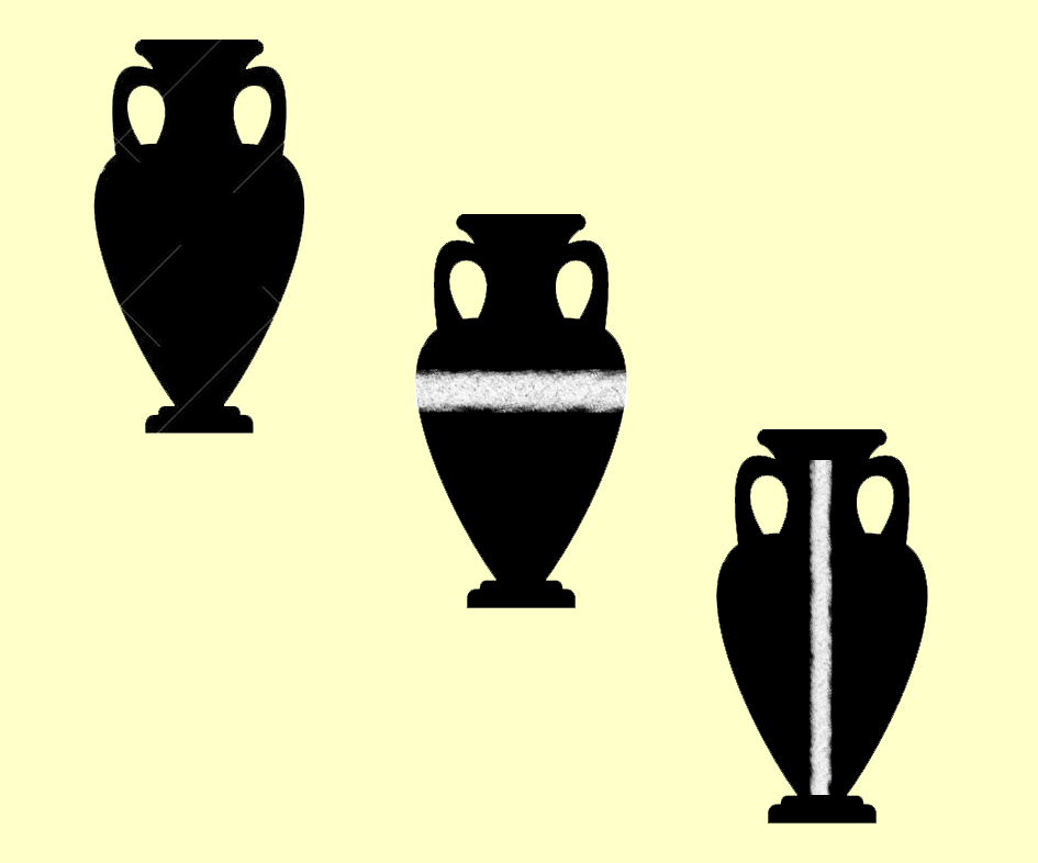 Cómo ya supondrás (y si no te lo digo yo), los tres tienen idénticas dimensiones (de hecho es el mismo jarrón copiado tres veces), pero no parecen iguales. El jarrón de la derecha (con corte vertical) aparenta ser más alto y estrecho que los otros dos. Por su parte, el jarrón que ocupa la posición central (con corte horizontal) se visualiza como el más bajo y ancho del trío. Estos efectos son fruto del Teorema de los Cortes.