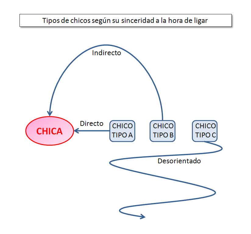 Chico tipo C: Este chico da un rodeo tan grande para pedir lo que quiere que se pierde en el trayecto. Por tanto NUNCA llegará a decir a la chica lo que le gustaría de ella. Es decir, nunca será sincero. Se conformará con la amistad trabajada en espera de encontrar la dirección correcta a su propósitos.